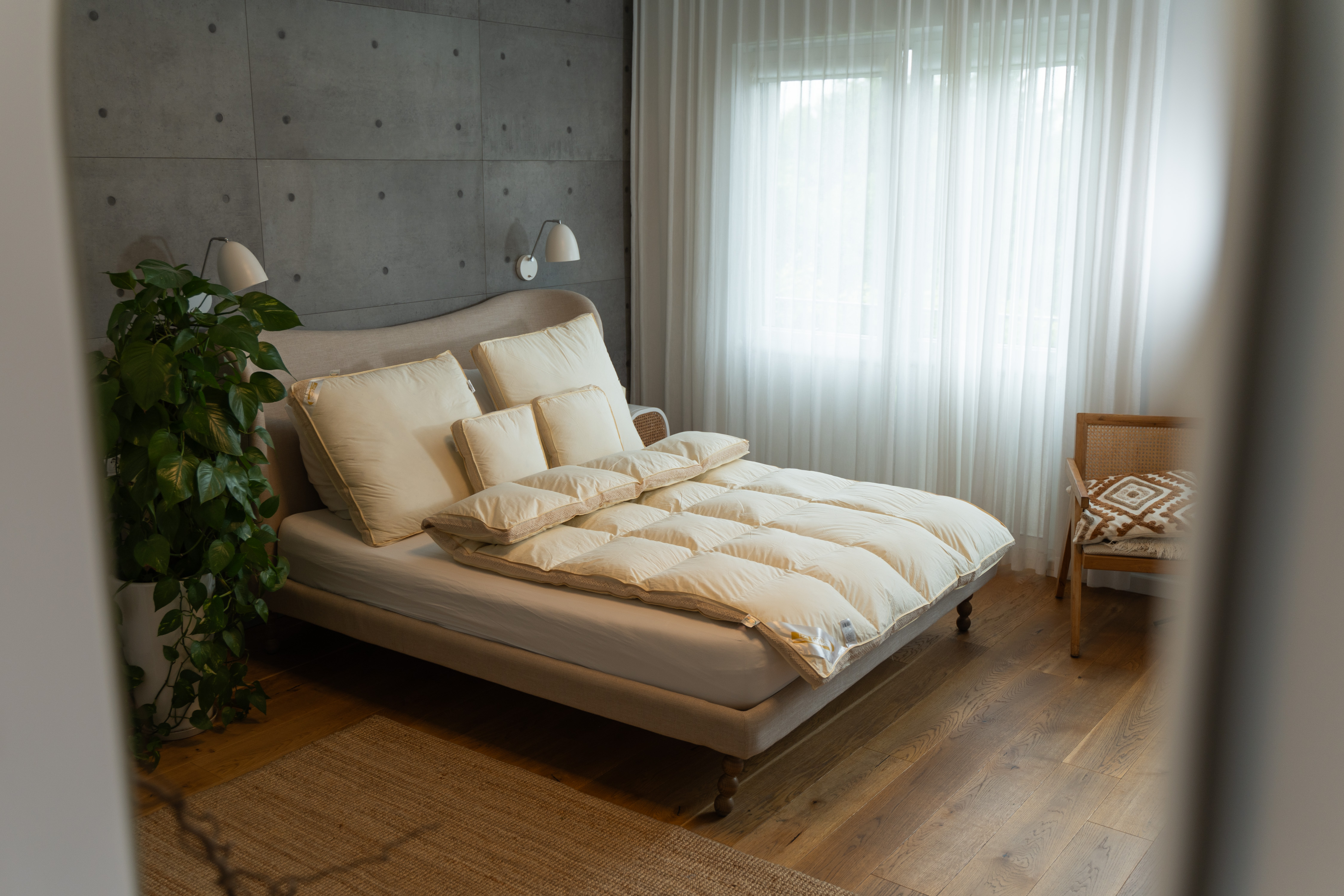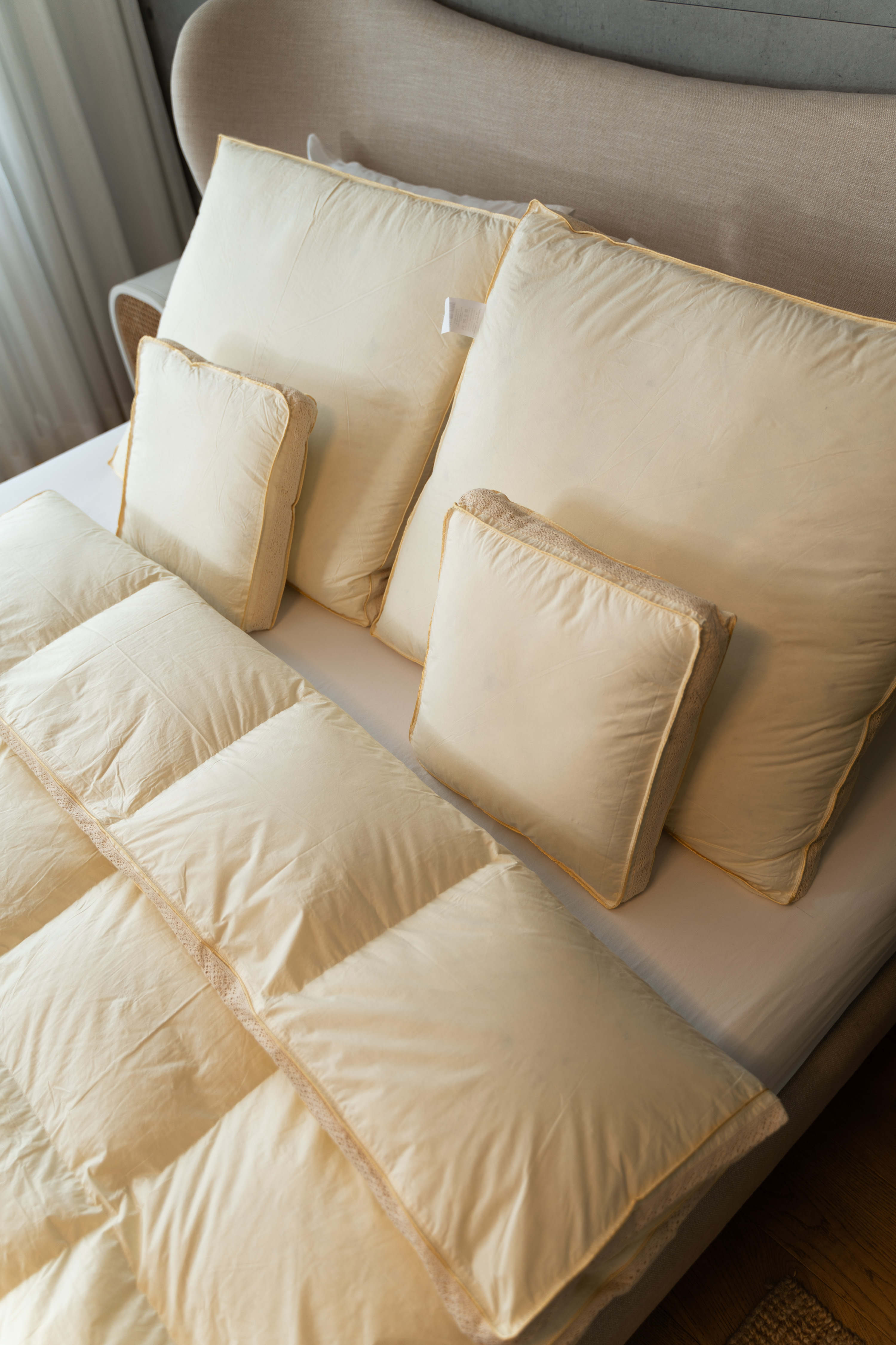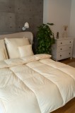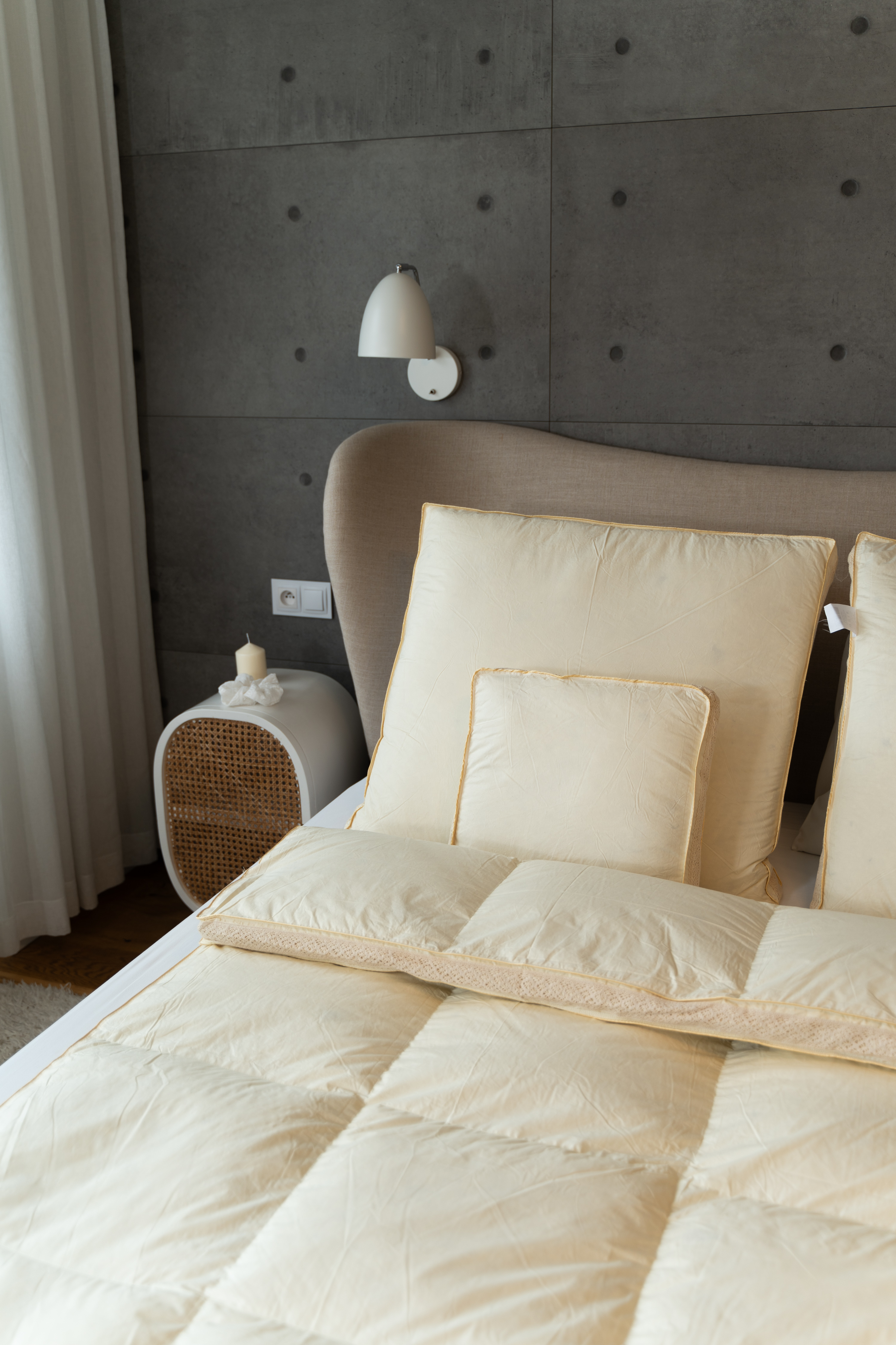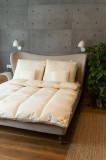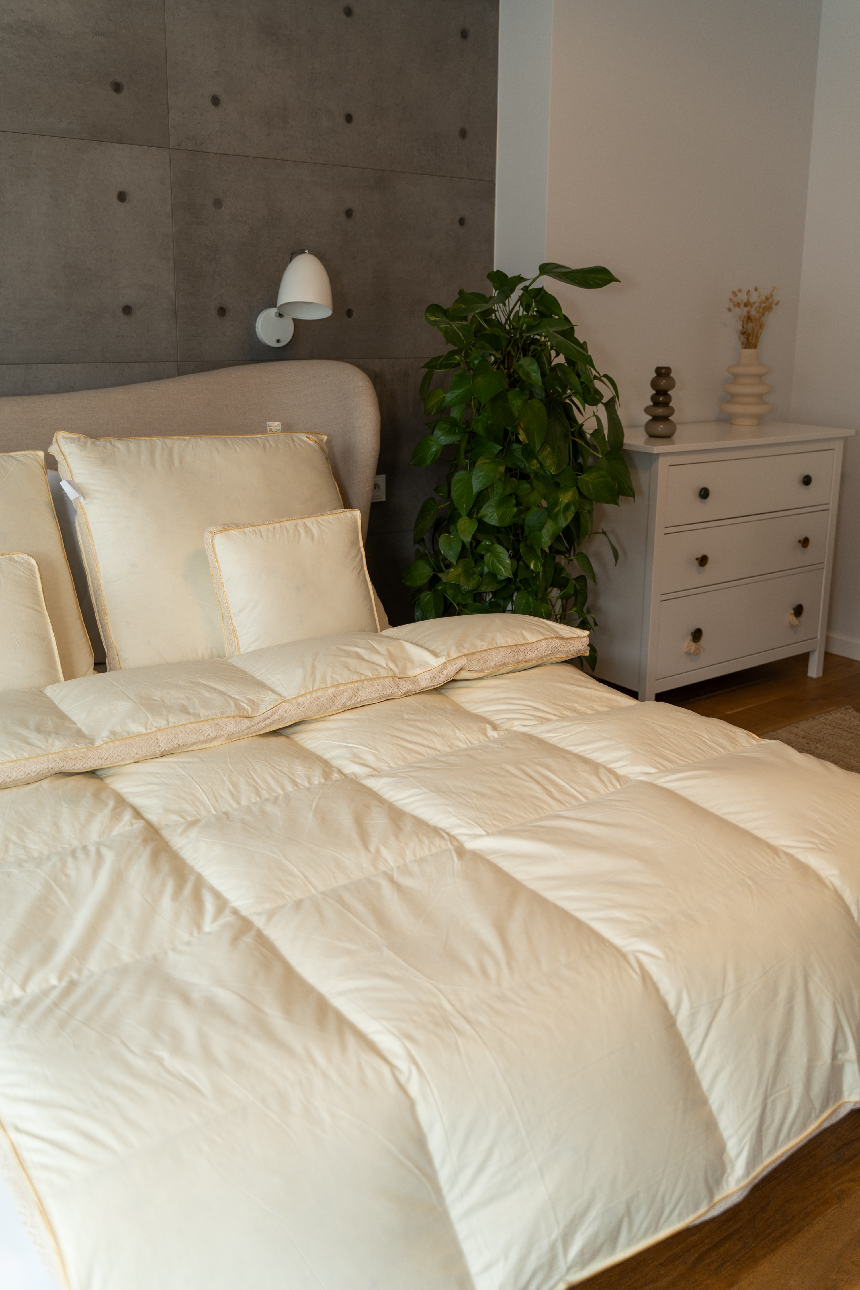 Ekskluzywna linia produktów pościelowych z doskonałej klasy wypełnieniem puchowym, starannie wyselekcjonowanym i otrzymywanym tylko w określonym okresie w roku. Elegancka kolekcja puchowa, średnio ciepła, uniwersalna, idealna dla spokojnego i przyjemnego snu. Wypełnienie składające się z odpowiednio sortowanego puchu gwarantuje niezapomniane doświadczenie snu, lekkość, ciepło oraz niezwykłą delikatność. Pokrycie tej luksusowej kolekcji wykonane jest z puchoszczelnego, szlachetnego materiału w delikatnym odcieniu ecru aksamitnego w dotyku. Uwieńczeniem produktu jest ścianka boczna ozdobiona elegancką szydełkową koronką w kolorze materiału oraz ekskluzywna podwójna złota lamówka, która nadaje produktom szczególnie luksusowy wymiar, podkreślając wysoką klasę wyrobu oraz dokładność i technikę wykonania.