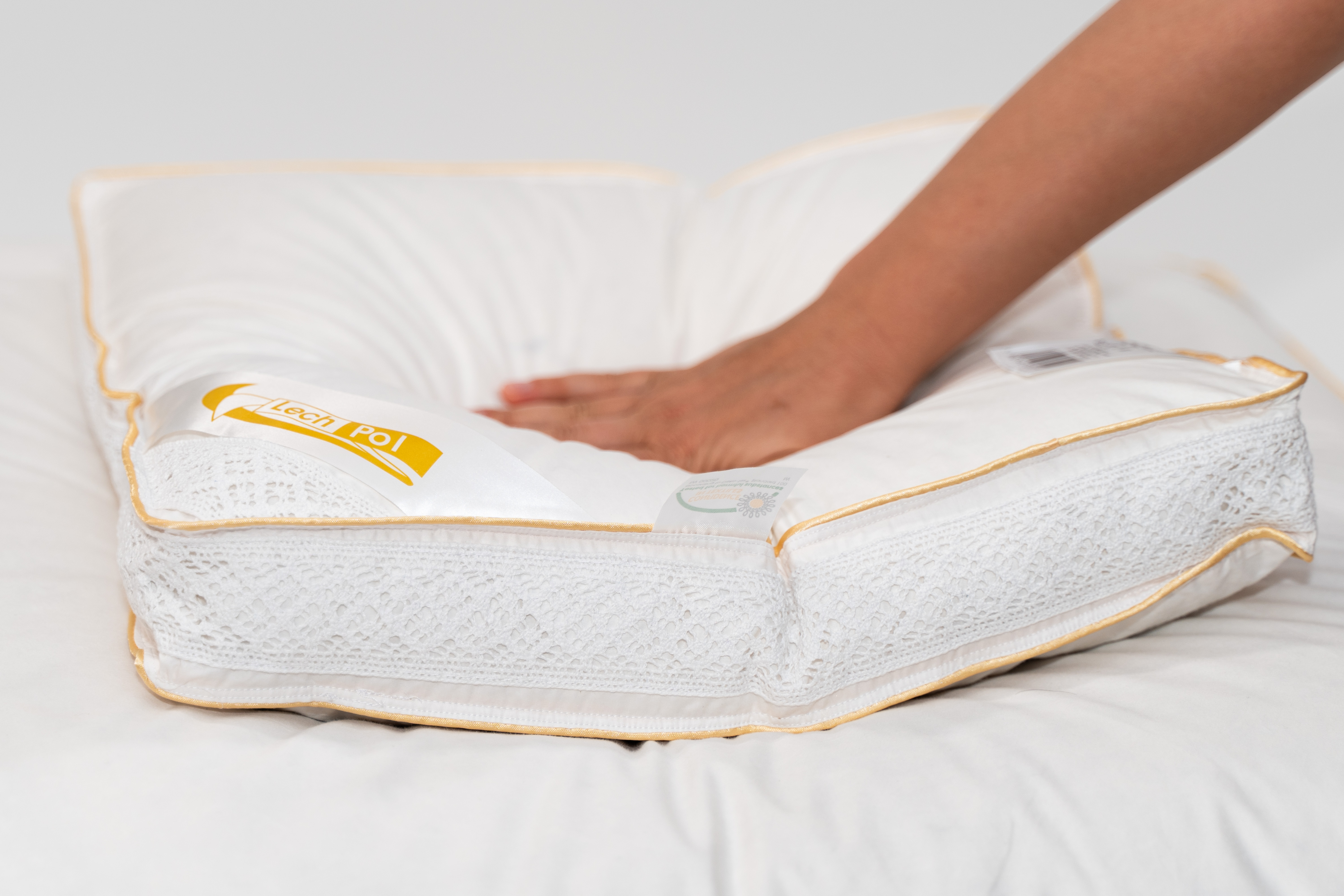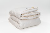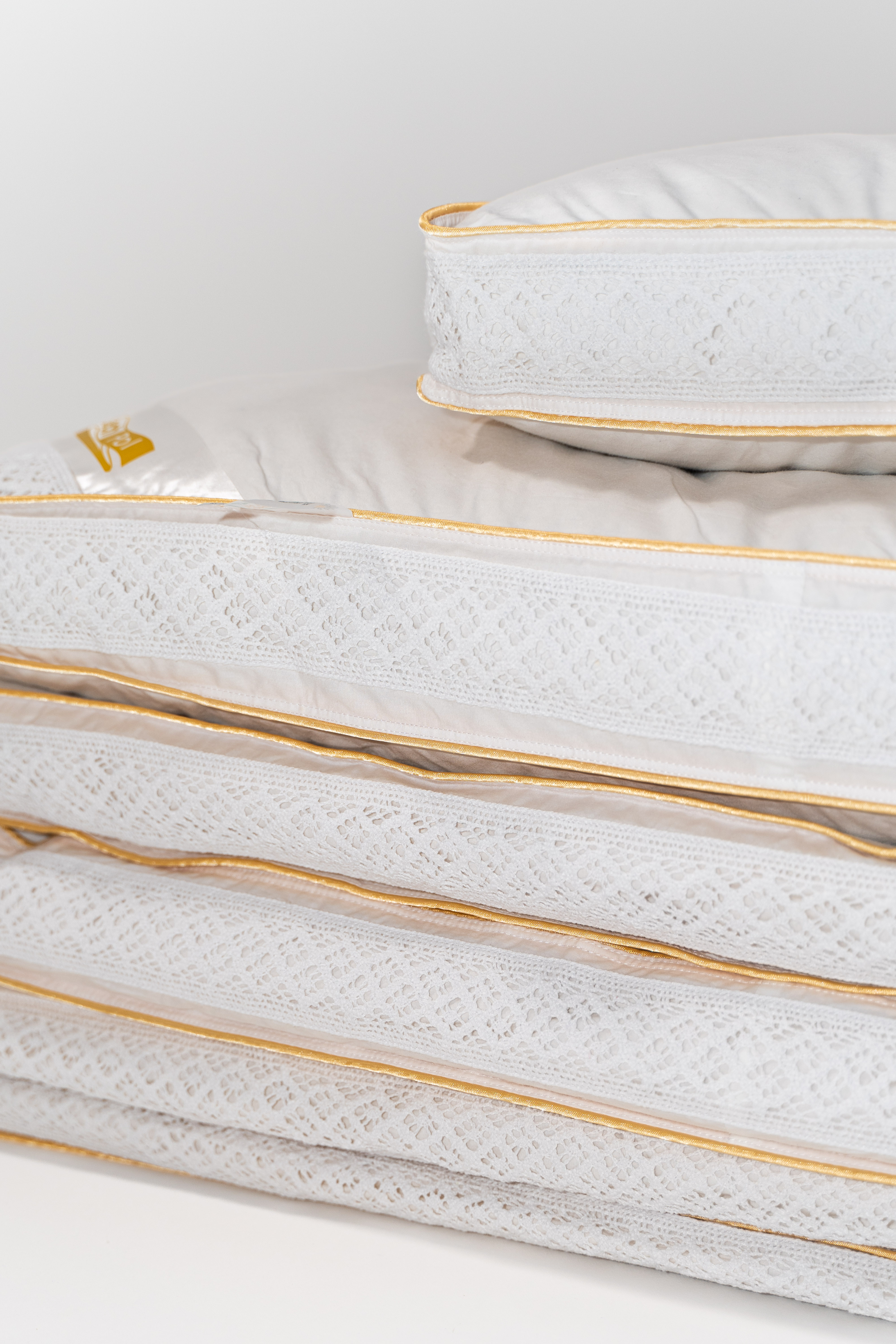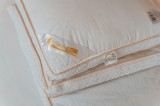 Ekskluzywna linia produktów pościelowych z doskonałej klasy wypełnieniem puchowym, starannie wyselekcjonowanym i otrzymywanym tylko w określonym okresie w roku. Elegancka kolekcja puchowa, uniwersalna, idealna dla spokojnego i przyjemnego snu. Wypełnienie składające się z odpowiednio sortowanego puchu gwarantuje niezapomniane doświadczenie snu, lekkość, ciepło oraz niezwykłą delikatność. Pokrycie tej luksusowej kolekcji wykonane jest z puchoszczelnego, szlachetnego materiału w delikatnym odcieniu bieli. Uwieńczeniem produktu jest ścianka boczna ozdobiona elegancką szydełkową koronką w kolorze materiału oraz ekskluzywna podwójna złota lamówka, która nadaje produktom szczególnie luksusowy wymiar, podkreślając wysoką klasę wyrobu oraz dokładność i technikę wykonania.