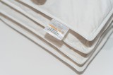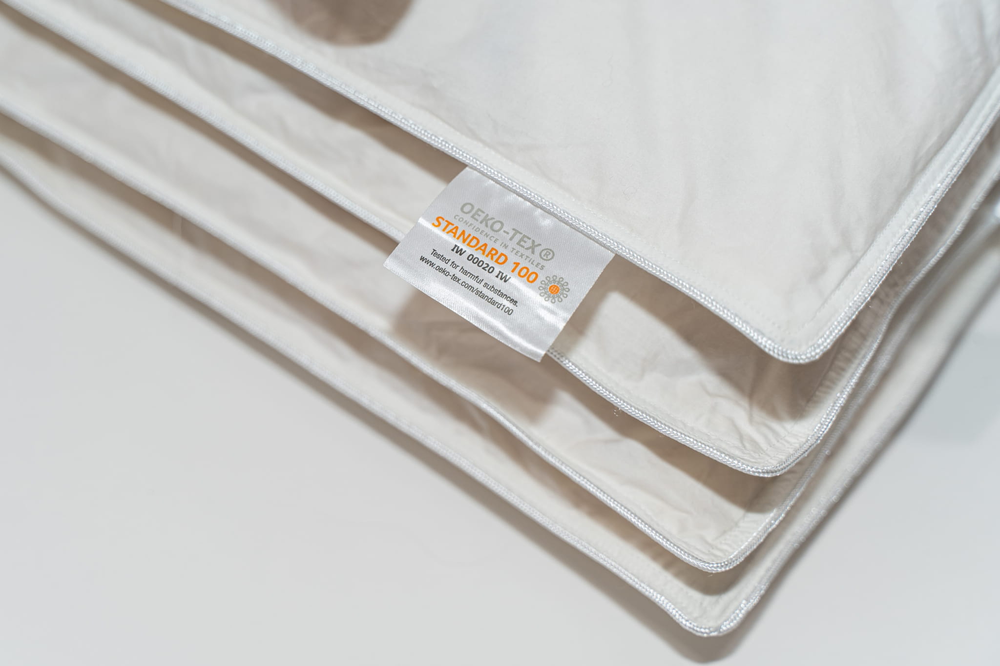 Wypełnienie – Biały Puch Gęsi, odpowiednio przygotowany zgodnie z Normami Europejskimi, Certyfikowany wg Oeko-Tex Standard 100. Dzięki zastosowaniu tak wysokiej jakości puchu, kołdry są wyjątkowo ciepłe nawet przy niskiej wadze wypełnienia. Puch gęsi charakteryzuje się wyjątkowymi właściwościami termicznymi, higroskopijnymi (absorbuje wilgoć), zapewnia przyjemną dla organizmu naturalność i delikatność. Puch Gęsi wypełniający kołdry i poduszki pobiera z otoczenia powietrze, a następnie utrzymuje je w pustych obszarach swoich promieni – zapewnia 100% odpowiedniej cyrkulacji powietrza dla organizmu ludzkiego, jakże istotnego podczas snu. Kołdra okrywająca ciało ludzkie gwarantuje ponadprzeciętną ochronę cieplną, nie powodując przy tym przegrzania organizmu. Kasetonowa konstrukcja kołder zapobiega powstawaniu zimnych stref ponieważ wypełnienie pozostaje równomiernie rozłożone na całej powierzchni. Natomiast poduszki umożliwiają odpowiedni opływ powietrza wokół głowy, dzięki czemu budzimy się wypoczęci i odprężeni. Na uwagę zasługuje również najwyższej jakości poszycie użyte w najnowszej kolekcji, które stanowi jedwabiście gładka, higieniczna i delikatna w dotyku bawełna w kolorze optycznej bieli o najwyższej możliwej gramaturze 400 (TC400FH). Zastosowany materiał poszycia – 100% bawełna wygładzana olejkiem aloesowym – zapewnia doskonały termoobieg powietrza, dzięki czemu użyte wypełnienie zachowuje wszystkie swoje właściwości przez bardzo długi czas.