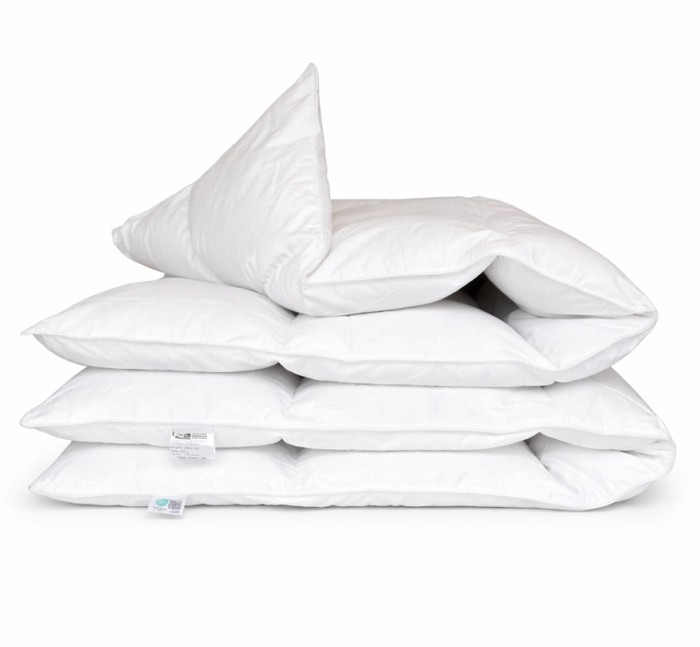 Wypełnienie – Biały Puch Gęsi, odpowiednio przygotowany zgodnie z Normami Europejskimi, Certyfikowany wg Oeko-Tex Standard 100. Dzięki zastosowaniu tak wysokiej jakości puchu, kołdry są wyjątkowo ciepłe nawet przy niskiej wadze wypełnienia. Puch gęsi charakteryzuje się wyjątkowymi właściwościami termicznymi, higroskopijnymi (absorbuje wilgoć), zapewnia przyjemną dla organizmu naturalność i delikatność. Puch Gęsi wypełniający kołdry i poduszki pobiera z otoczenia powietrze, a następnie utrzymuje je w pustych obszarach swoich promieni – zapewnia 100% odpowiedniej cyrkulacji powietrza dla organizmu ludzkiego, jakże istotnego podczas snu. Kołdra okrywająca ciało ludzkie gwarantuje ponadprzeciętną ochronę cieplną, nie powodując przy tym przegrzania organizmu. Kasetonowa konstrukcja kołder zapobiega powstawaniu zimnych stref ponieważ wypełnienie pozostaje równomiernie rozłożone na całej powierzchni. Natomiast poduszki umożliwiają odpowiedni opływ powietrza wokół głowy, dzięki czemu budzimy się wypoczęci i odprężeni. Na uwagę zasługuje również najwyższej jakości poszycie użyte w najnowszej kolekcji, które stanowi jedwabiście gładka, higieniczna i delikatna w dotyku bawełna w kolorze optycznej bieli o najwyższej możliwej gramaturze 400 (TC400FH). Zastosowany materiał poszycia – 100% bawełna wygładzana olejkiem aloesowym – zapewnia doskonały termoobieg powietrza, dzięki czemu użyte wypełnienie zachowuje wszystkie swoje właściwości przez bardzo długi czas.