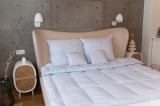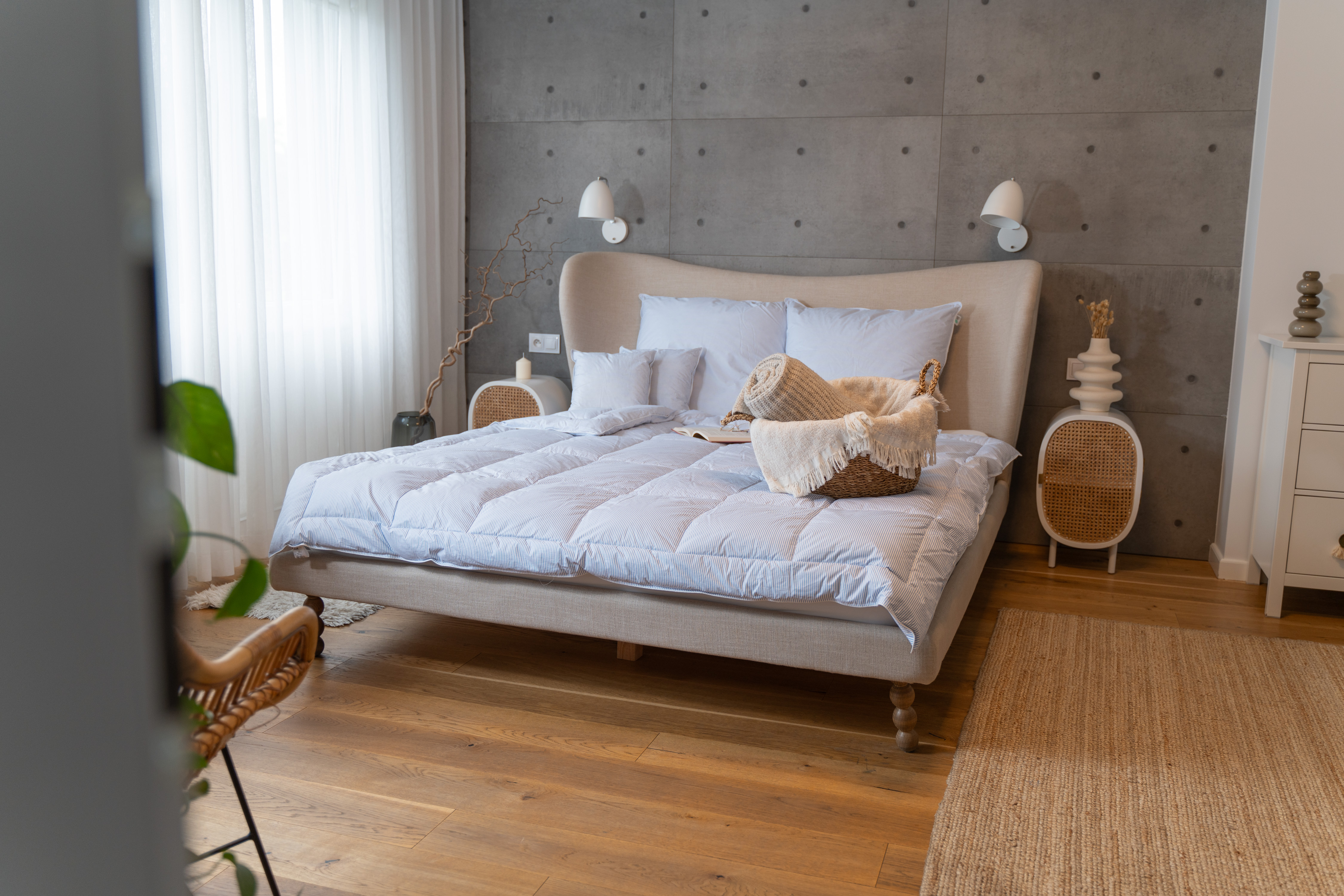 Nasza kolekcja idealnie wpisuje się w obecne trendy na rynku tekstyliów domowych i pościelowych. Poprzez wykorzystanie wysokiej jakości materiałów produkty z serii White & Blue są wyjątkowo trwałe i mogą nam służyć przez długie lata nie tracąc swoich właściwości. Tkaninę poszycia stanowi puchoszczelna bawełna. Jest to materiał o gęstym splocie niezwykle miękki i delikatny. Ekskluzywny wygląd produktu dodatkowo podkreśla nadruk biało-niebieskich prążków przedstawiający skandynawski design, coraz bardziej popularny na polskim rynku. Wypełnienia stanowi puch gęsi. Dzięki temu kołdra jest zarówno ciepła, jak i lekka. Puch to wysokiej jakości surowiec cechujący się dużą wypornością. Wypełnione nim kołdry i poduszki są sprężyste oraz lekkie przy zachowaniu wysokiego współczynnika termoizolacji. Każdy produkt wykończono dekoracyjną bawełnianą lamówką, stanowiącą dodatkowe zabezpieczenie przed wydostawaniem się puchu na zewnątrz. Całość tworzy precyzyjnie wykonany produkt najwyższej jakości zapewniający komfort snu i zadowolenie z długotrwałego użytkowania.