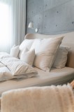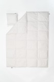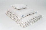 Wypełnienie – Biały Puch Gęsi, odpowiednio przygotowany zgodnie z Normami Europejskimi, Certyfikowany wg Oeko-Tex Standard 100. Dzięki zastosowaniu tak wysokiej jakości puchu, kołdry są wyjątkowo ciepłe nawet przy niskiej wadze wypełnienia. Puch gęsi charakteryzuje się wyjątkowymi właściwościami termicznymi, higroskopijnymi (absorbuje wilgoć), zapewnia przyjemną dla organizmu naturalność i delikatność. Puch Gęsi wypełniający kołdry i poduszki pobiera z otoczenia powietrze, a następnie utrzymuje je w pustych obszarach swoich promieni – zapewnia 100% odpowiedniej cyrkulacji powietrza dla organizmu ludzkiego, jakże istotnego podczas snu. Kołdra okrywająca ciało ludzkie gwarantuje ponadprzeciętną ochronę cieplną, nie powodując przy tym przegrzania organizmu. Kasetonowa konstrukcja kołder zapobiega powstawaniu zimnych stref ponieważ wypełnienie pozostaje równomiernie rozłożone na całej powierzchni. Natomiast poduszki umożliwiają odpowiedni opływ powietrza wokół głowy, dzięki czemu budzimy się wypoczęci i odprężeni. Na uwagę zasługuje również najwyższej jakości poszycie użyte w najnowszej kolekcji, które stanowi jedwabiście gładka, higieniczna i delikatna w dotyku bawełna w kolorze optycznej bieli o najwyższej możliwej gramaturze 400 (TC400FH). Zastosowany materiał poszycia – 100% bawełna wygładzana olejkiem aloesowym – zapewnia doskonały termoobieg powietrza, dzięki czemu użyte wypełnienie zachowuje wszystkie swoje właściwości przez bardzo długi czas.