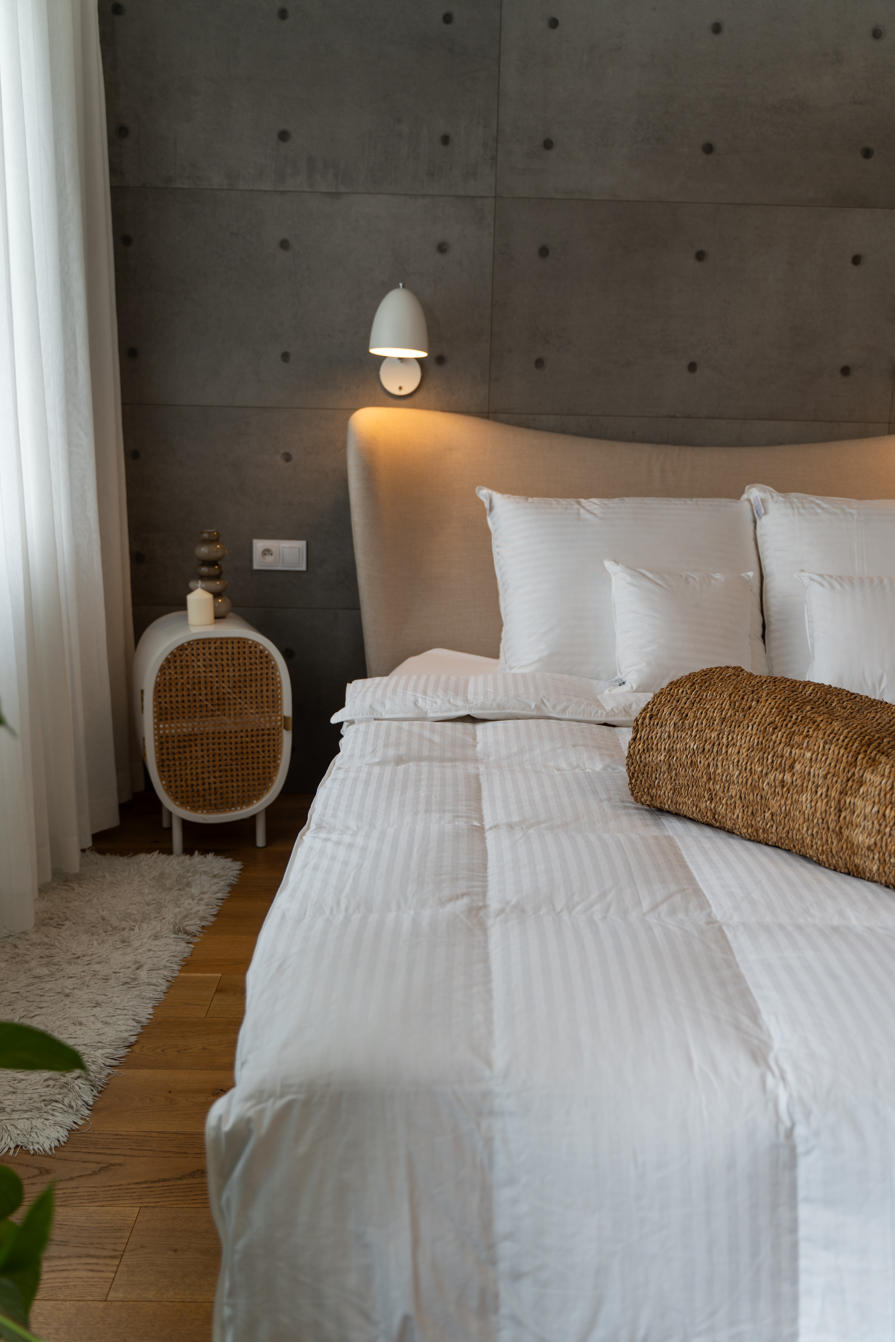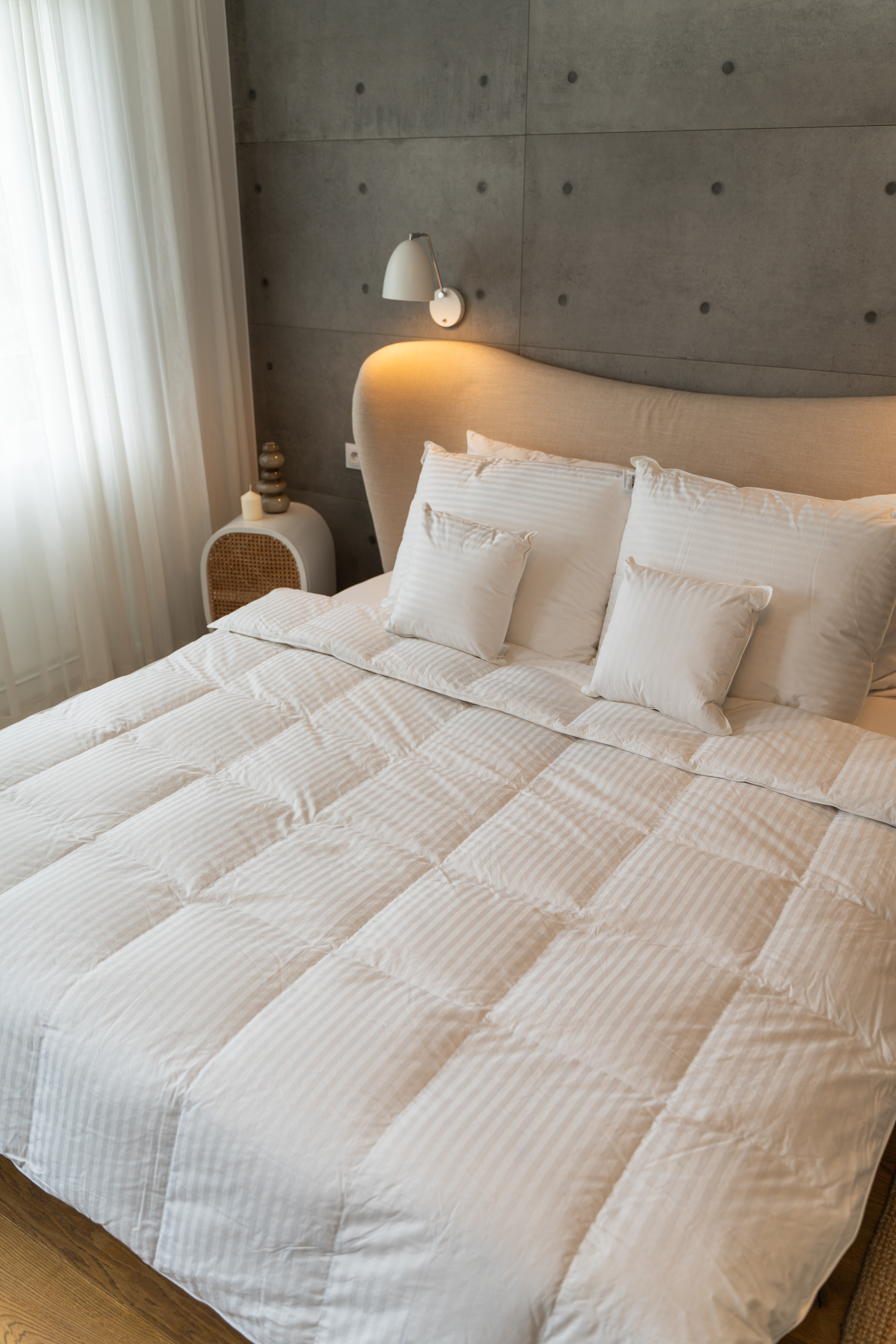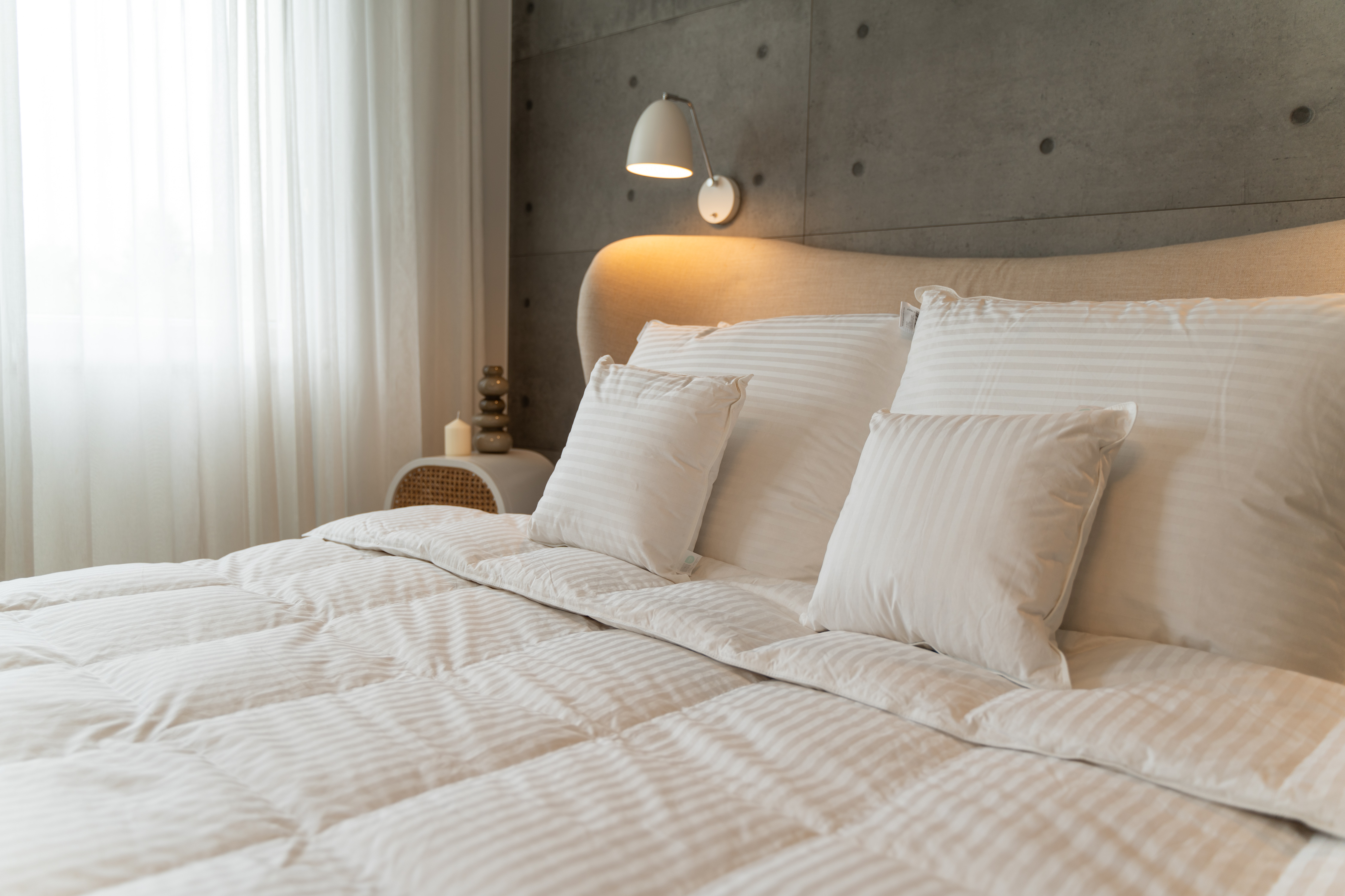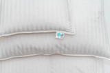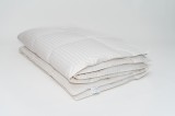 Wypełnienie – Biały Puch Gęsi, odpowiednio przygotowany zgodnie z Normami Europejskimi, Certyfikowany wg Oeko-Tex Standard 100. Dzięki zastosowaniu tak wysokiej jakości puchu, kołdry są wyjątkowo ciepłe nawet przy niskiej wadze wypełnienia. Puch gęsi charakteryzuje się wyjątkowymi właściwościami termicznymi, higroskopijnymi (absorbuje wilgoć), zapewnia przyjemną dla organizmu naturalność i delikatność. Puch Gęsi wypełniający kołdry i poduszki pobiera z otoczenia powietrze, a następnie utrzymuje je w pustych obszarach swoich promieni – zapewnia 100% odpowiedniej cyrkulacji powietrza dla organizmu ludzkiego, jakże istotnego podczas snu. Kołdra okrywająca ciało ludzkie gwarantuje ponadprzeciętną ochronę cieplną, nie powodując przy tym przegrzania organizmu. Kasetonowa konstrukcja kołder zapobiega powstawaniu zimnych stref, ponieważ wypełnienie pozostaje równomiernie rozłożone na całej powierzchni. Natomiast poduszki umożliwiają odpowiedni opływ powietrza wokół głowy, dzięki czemu budzimy się wypoczęci i odprężeni. Poszycie użyte w najnowszej kolekcji, które stanowi jedwabiście gładka, higieniczna i delikatna w dotyku bawełna z delikatnymi paskami w kolorze bieli. Zastosowany materiał poszycia –100% bawełna - zapewnia doskonały termoobieg powietrza, dzięki czemu użyte wypełnienie zachowuje wszystkie swoje właściwości przez bardzo długi czas.
