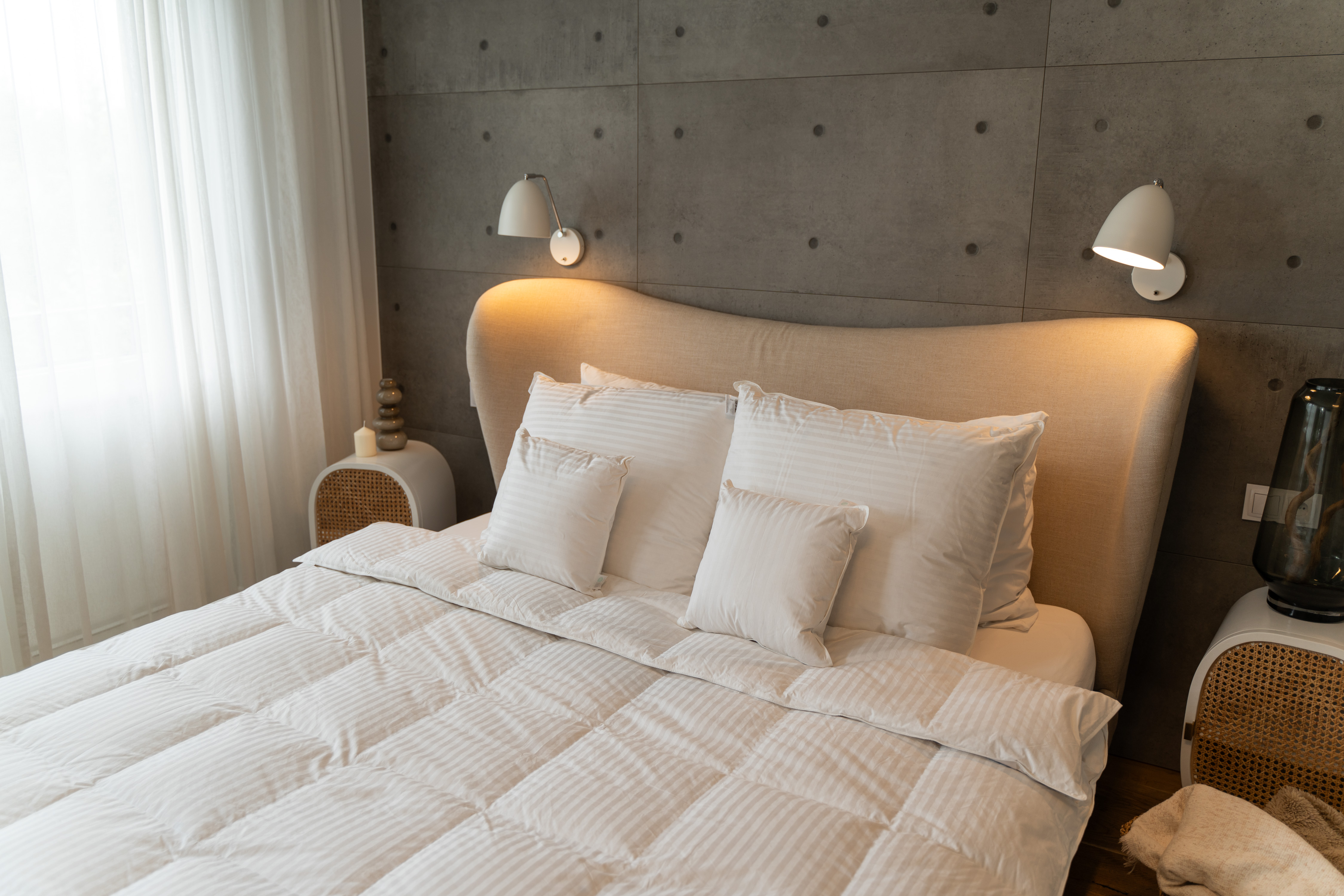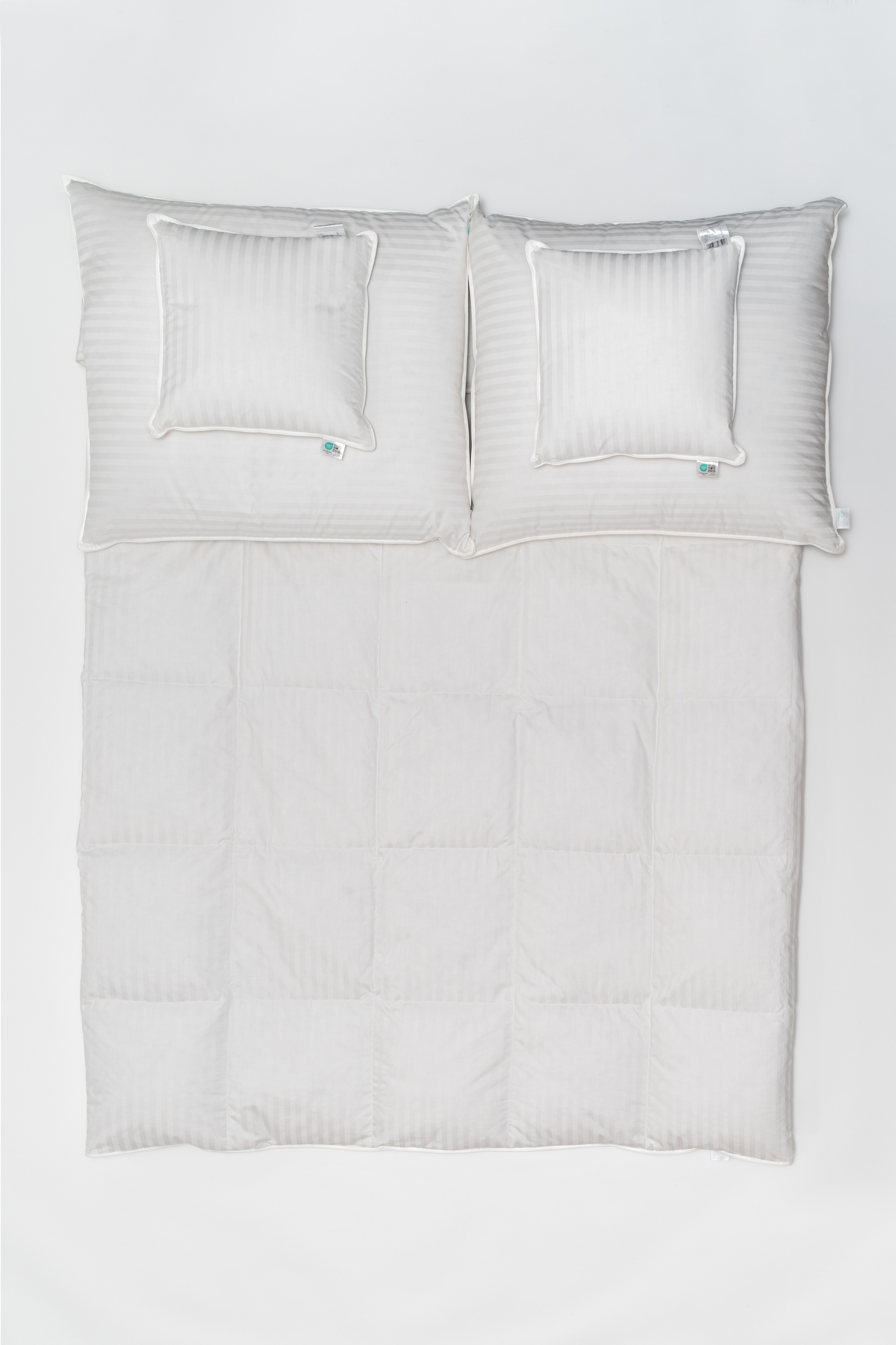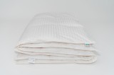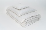 Wypełnienie – Biały Puch Gęsi, odpowiednio przygotowany zgodnie z Normami Europejskimi, Certyfikowany wg Oeko-Tex Standard 100. Dzięki zastosowaniu tak wysokiej jakości puchu, kołdry są wyjątkowo ciepłe nawet przy niskiej wadze wypełnienia. Puch gęsi charakteryzuje się wyjątkowymi właściwościami termicznymi, higroskopijnymi (absorbuje wilgoć), zapewnia przyjemną dla organizmu naturalność i delikatność. Puch Gęsi wypełniający kołdry i poduszki pobiera z otoczenia powietrze, a następnie utrzymuje je w pustych obszarach swoich promieni – zapewnia 100% odpowiedniej cyrkulacji powietrza dla organizmu ludzkiego, jakże istotnego podczas snu. Kołdra okrywająca ciało ludzkie gwarantuje ponadprzeciętną ochronę cieplną, nie powodując przy tym przegrzania organizmu. Kasetonowa konstrukcja kołder zapobiega powstawaniu zimnych stref, ponieważ wypełnienie pozostaje równomiernie rozłożone na całej powierzchni. Natomiast poduszki umożliwiają odpowiedni opływ powietrza wokół głowy, dzięki czemu budzimy się wypoczęci i odprężeni. Poszycie użyte w najnowszej kolekcji, które stanowi jedwabiście gładka, higieniczna i delikatna w dotyku bawełna z delikatnymi paskami w kolorze bieli. Zastosowany materiał poszycia –100% bawełna - zapewnia doskonały termoobieg powietrza, dzięki czemu użyte wypełnienie zachowuje wszystkie swoje właściwości przez bardzo długi czas.
