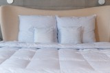 Nasza kolekcja idealnie wpisuje się w obecne trendy na rynku tekstyliów domowych i pościelowych. Poprzez wykorzystanie wysokiej jakości materiałów produkty z serii White & Blue są wyjątkowo trwałe i mogą nam służyć przez długie lata nie tracąc swoich właściwości. Tkaninę poszycia stanowi puchoszczelna bawełna. Jest to materiał o gęstym splocie, niezwykle miękki i delikatny. Ekskluzywny wygląd produktu dodatkowo podkreśla nadruk biało-niebieskich prążków przedstawiający skandynawski design, coraz bardziej popularny na polskim rynku. Wypełnienia stanowi puch gęsi. Dzięki temu kołdra jest zarówno ciepła, jak i lekka. Puch to wysokiej jakości surowiec cechujący się dużą wypornością. Wypełnione nim kołdry i poduszki są sprężyste oraz lekkie przy zachowaniu wysokiego współczynnika termoizolacji. Każdy produkt wykończono dekoracyjną bawełnianą lamówką, stanowiącą dodatkowe zabezpieczenie przed wydostawaniem się puchu na zewnątrz. Całość tworzy precyzyjnie wykonany produkt najwyższej jakości zapewniający komfort snu i zadowolenie z długotrwałego użytkowania.