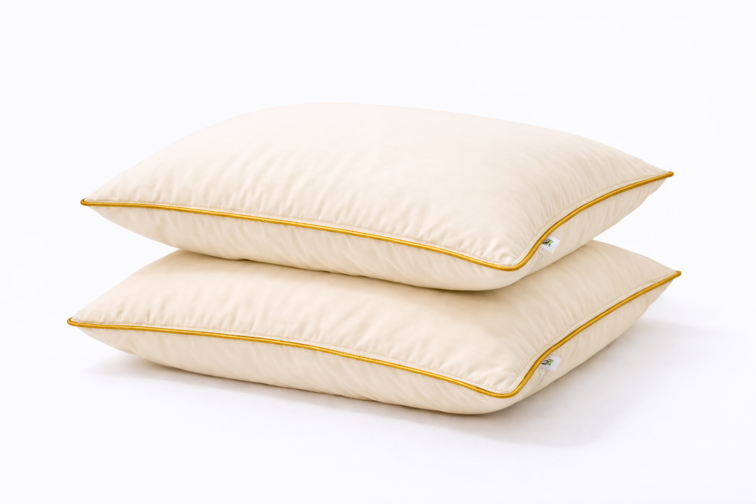 Poszycie wykonane jest w 100% z gęsto tkanej bawełny w eleganckim kolorze ecru, wykończone stylową złotą lamówką. Tkanina o bardzo zwartym splocie, dodatkowo woskowana od wewnątrz, skutecznie zapobiega wydostawaniu się wypełnienia na zewnątrz. Lamówka nie tylko podnosi walory estetyczne produktu, ale również wzmacnia jego trwałość i szczelność.