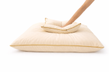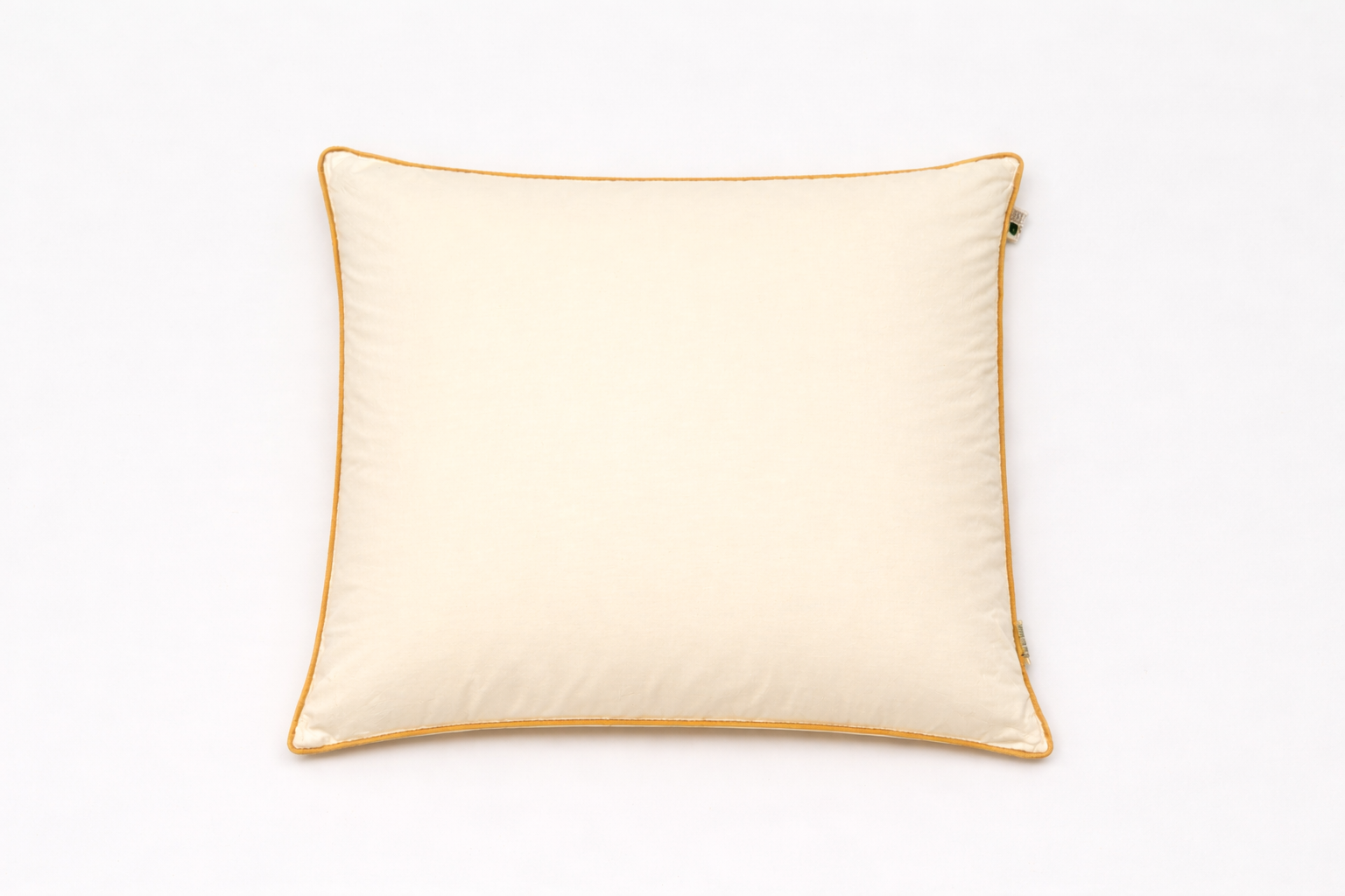 Poszycie wykonane jest w 100% z gęsto tkanej bawełny w eleganckim kolorze ecru, wykończone stylową złotą lamówką. Tkanina o bardzo zwartym splocie, dodatkowo woskowana od wewnątrz, skutecznie zapobiega wydostawaniu się wypełnienia na zewnątrz. Lamówka nie tylko podnosi walory estetyczne produktu, ale również wzmacnia jego trwałość i szczelność.