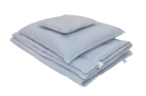 Nasza kolekcja idealnie wpisuje się w obecne trendy na rynku tekstyliów domowych i pościelowych. Poprzez wykorzystanie wysokiej jakości materiałów produkty z serii White & Blue są wyjątkowo trwałe i mogą nam służyć przez długie lata nie tracąc swoich właściwości. Tkaninę poszycia stanowi puchoszczelny bawełniany batyst. Jest to materiał o gęstym splocie niezwykle miękki i delikatny. Ekskluzywny wygląd produktu dodatkowo podkreśla nadruk biało-niebieskich prążków przedstawiający skandynawski design, coraz bardziej popularny na polskim rynku. Wypełnienia stanowi puch gęsi. Dzięki temu kołdra jest zarówno ciepła, jak i lekka. Puch to wysokiej jakości surowiec cechujący się dużą wypornością. Wypełnione nim kołdry i poduszki są sprężyste oraz lekkie przy zachowaniu wysokiego współczynnika termoizolacji. Każdy produkt wykończono dekoracyjną bawełnianą lamówką, stanowiącą dodatkowe zabezpieczenie przed wydostawaniem się puchu na zewnątrz. Całość tworzy precyzyjnie wykonany produkt najwyższej jakości zapewniający komfort snu i zadowolenie z długotrwałego użytkowania.